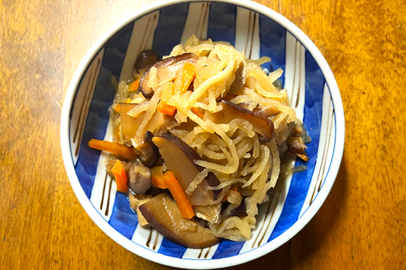 ②切り干し大根は食べやすい大きさに、干し椎茸は軸をとって薄切りに、にんじんは細切りに、あげは短冊切りにします。